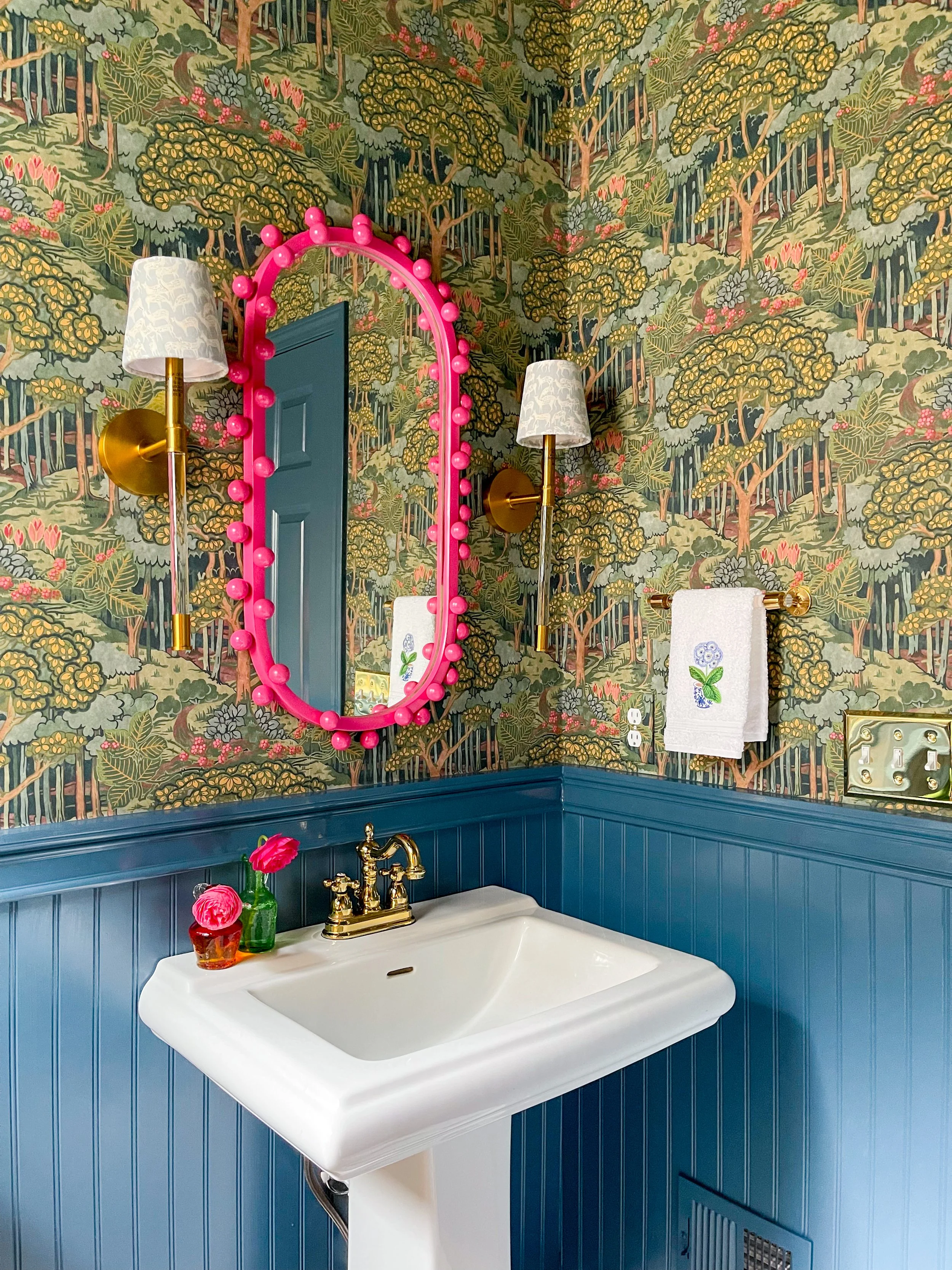 When I was working on the no-renovation makeover of my boring builder-beige powder bath, I knew I wanted a statement mirror for the bathroom that carried the same bold personality as the wallpaper. The mirror and wallpaper needed to walk shoulder to shoulder — a true colorful bathroom accent that would take the space to the next level.